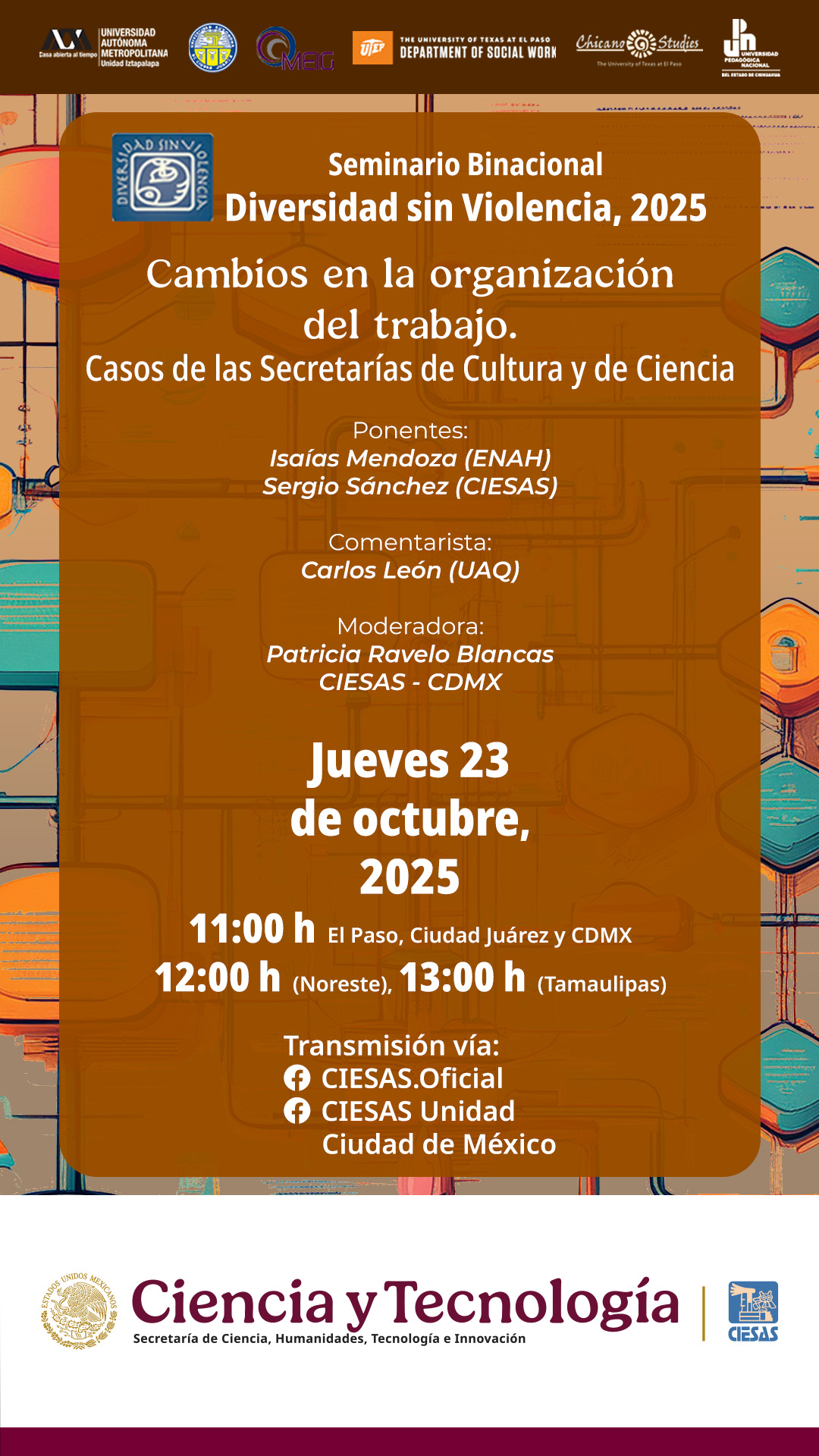 El Seminario Binacional Diversidad sin Violencia presenta Cambios en la organización del trabajo. Casos de las Secretarías de Cultura y de Ciencia, a cargo de Isaías Mendoza (ENAH) y Sergio Sánchez (CIESAS).