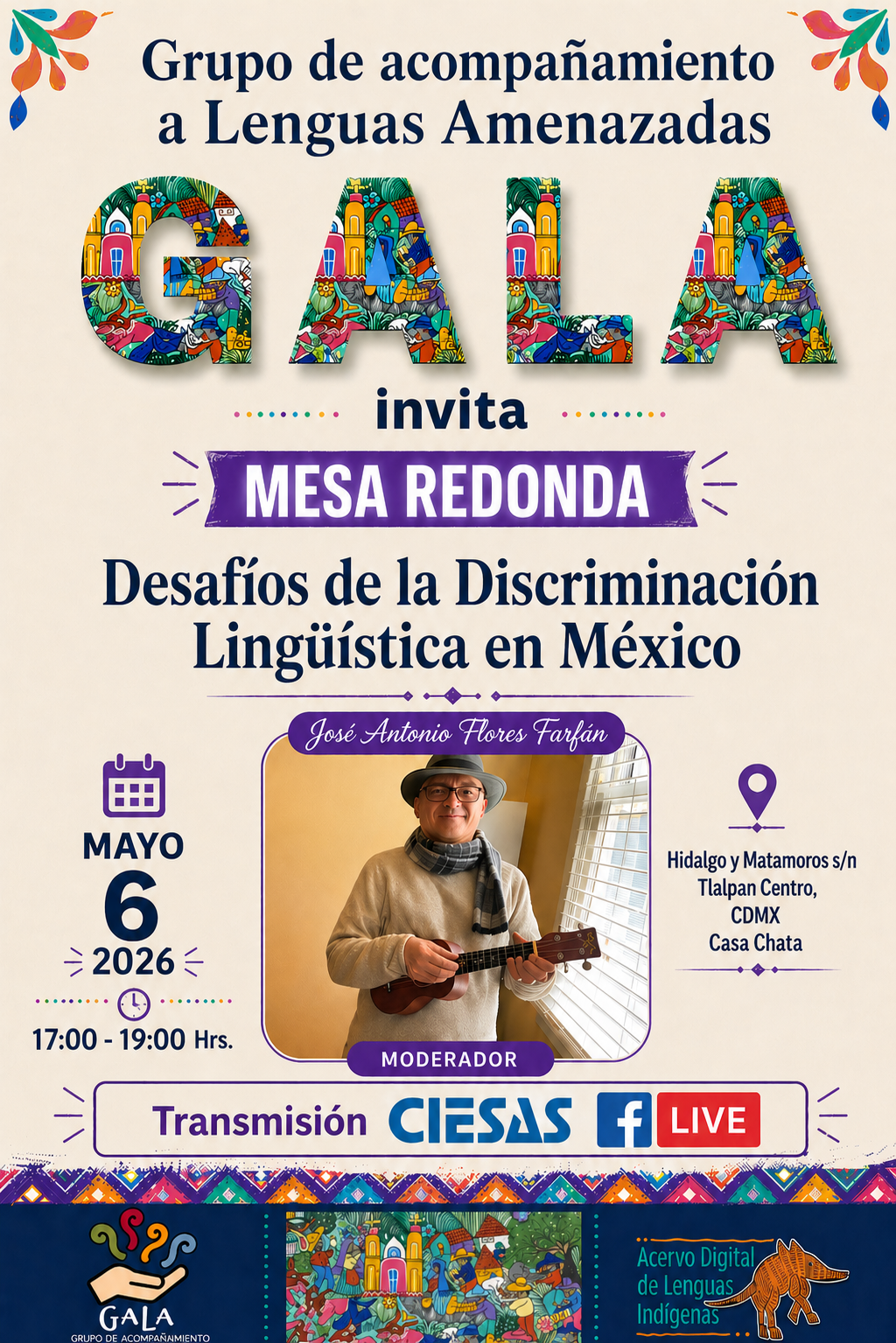 El Laboratorio de Lengua y Cultura en conjunto con el Grupo de acompañamiento a Lenguas Amenazadas (GALA) invita a la mesa redonda Desafíos de la Discriminación Lingüística en México, encabezada por José Antonio Flores Farfán y que se llevará a cabo en las instalaciones de la Casa Chata, con transmisión por Facebook Live.