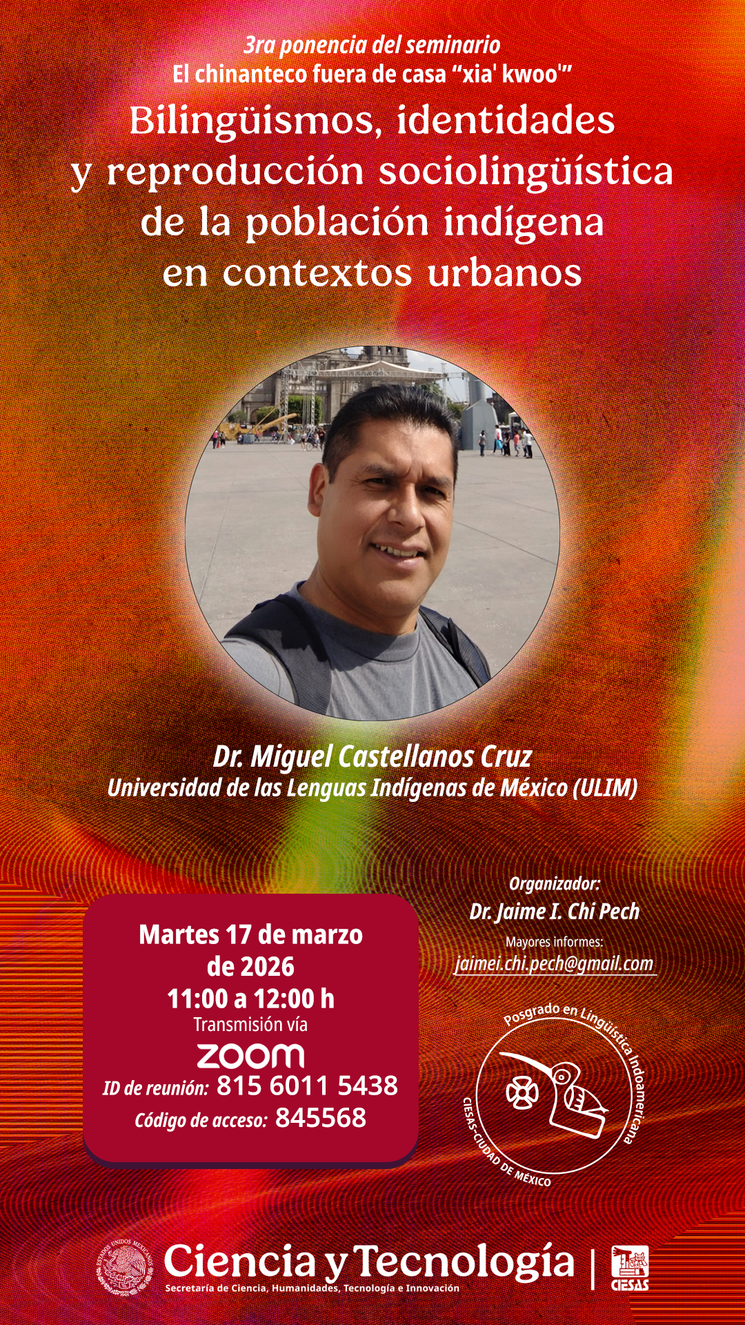 El Seminario Bilingüismos, identidades y reproducción sociolingüística de la población indígena en contextos urbanos invita a su ponencia El chinanteco fuera de casa “xiaˈ kwooˈ, a cargo del Dr. Miguel Castellanos Cruz, la cual podrá seguirse a través de la plataforma Zoom.