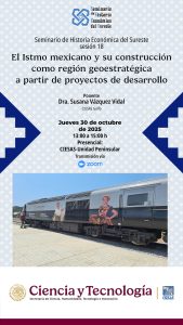El Seminario de Historia Económica del Sureste invita a la ponencia El Istmo mexicano y su construcción como región geoestratégica a partir de proyectos de desarrollo, a cargo de la Dra. Susana Vázquez Vidal.