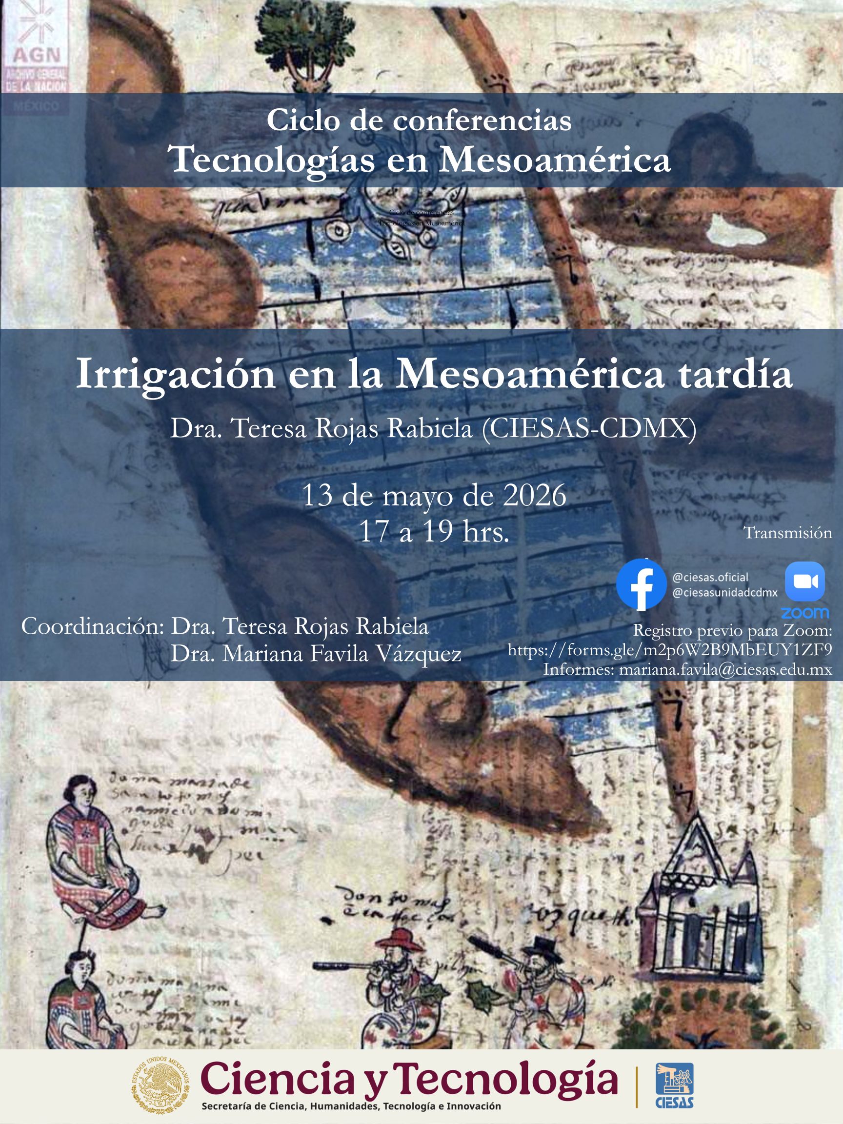 El CIESAS invita a la conferencia Irrigación en la América tardía, la cual forma parte del Ciclo de conferencias Tecnologías en Mesoamérica. En esta ocasión, se contará con la participación de la Dra. Teresa Rojas Rabiela, pionera en el estudio de la agricultura e hidráulica mesoamericana, y la Dra. Mariana Favila Vázquez, especialista en navegación y paisajes lacustres coloniales.