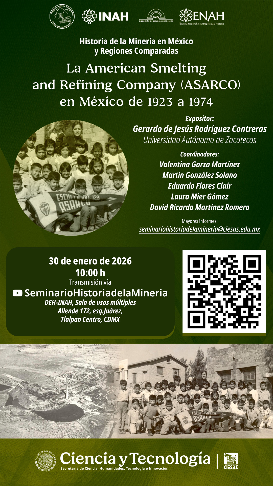 El Seminario Historia de la Minería en México y Regiones Comparadas presenta La American Smelting and Refining Company (ASARCO) en México de 1923 a 1974, a cargo de Gerardo de Jesús Rodríguez Contreras (Universidad Autónoma de Zacatecas).