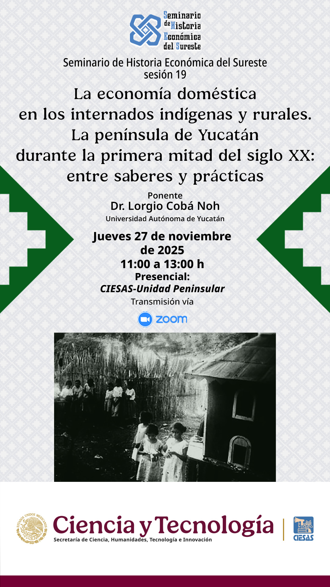 El Seminario de Historia Económica del Sureste invita a la ponencia La economía doméstica en los internados indígenas y rurales. La península de Yucatán durante la primera mitad del siglo XX: entre saberes y prácticas, a cargo del Dr. Lorgio Cobá Noh de la Universidad Autónoma de Yucatán.
