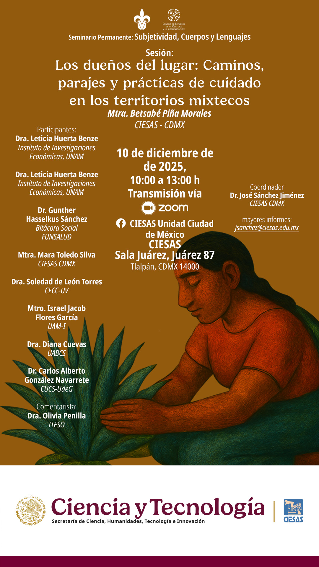 El Seminario Permanente: Subjetividad, Cuerpos y Lenguajes presenta Los dueños del lugar: Caminos, parajes y prácticas de cuidado en los territorios mixtecos, a cargo de la Mtra. Betsabé Piña Morales del CIESAS CDMX.