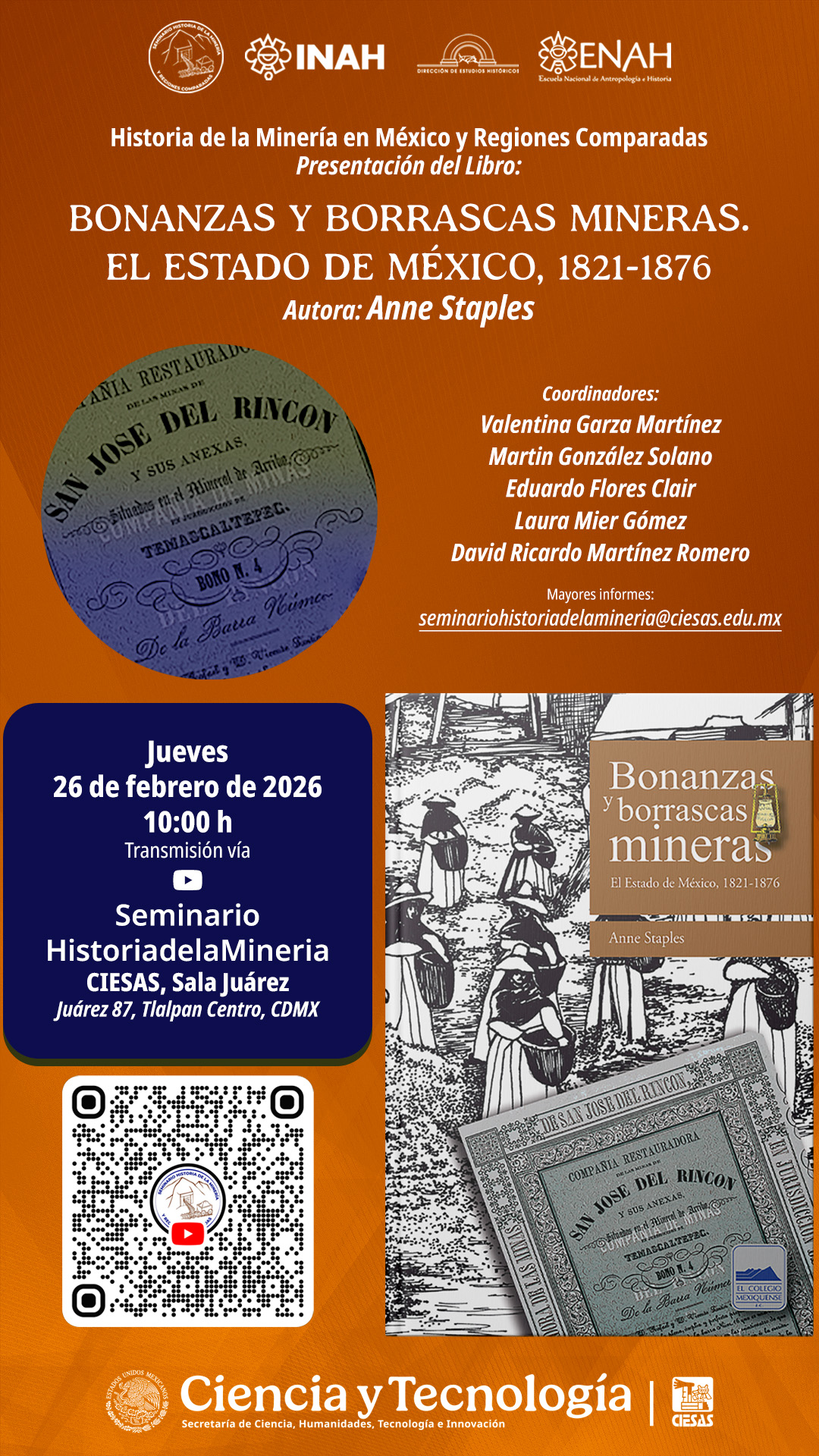 El Seminario Historia de la Minería en México y Regiones Comparadas invita a la presentación editorial de Bonanzas y borrascas mineras. El Estado de México, 1821-1876, de la autora Anne Staples.