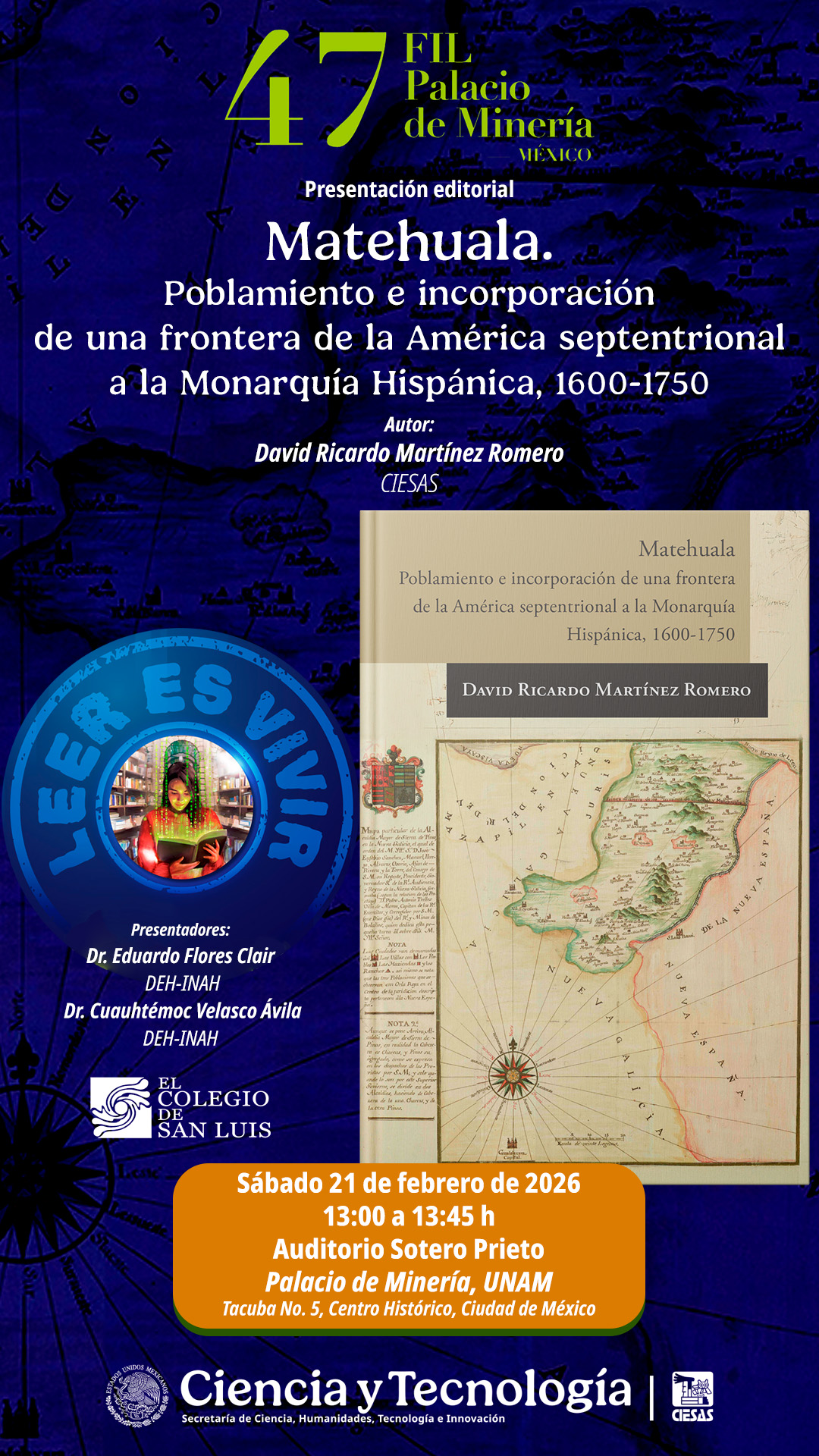 Como parte de las actividades de la 47 Feria Internacional del Libro del Palacio de Minería, que se celebrará del 20 de febrero al 1 de marzo, se presentará su libro Matehuala. Poblamiento e incorporación de una frontera de la América septentrional a la Monarquía Hispánica, 1600-1750.