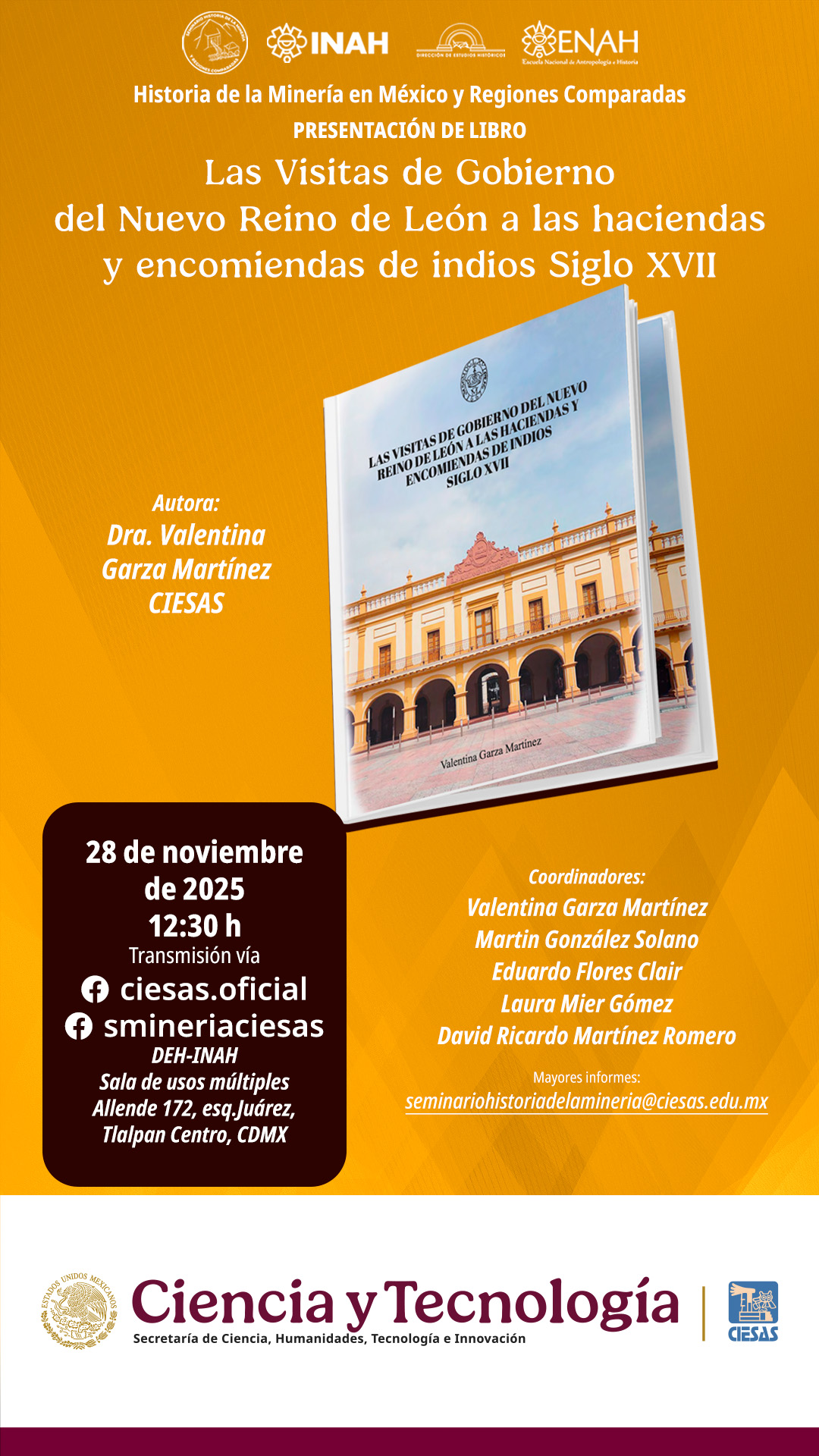 El Seminario Historia de la Minería en México y Regiones Comparadas invita a la presentación editorial de Las Visitas de Gobierno del Nuevo Reino de León a las haciendas y encomiendas de indios Siglo XVII, de la autora Valentina Garza Martínez