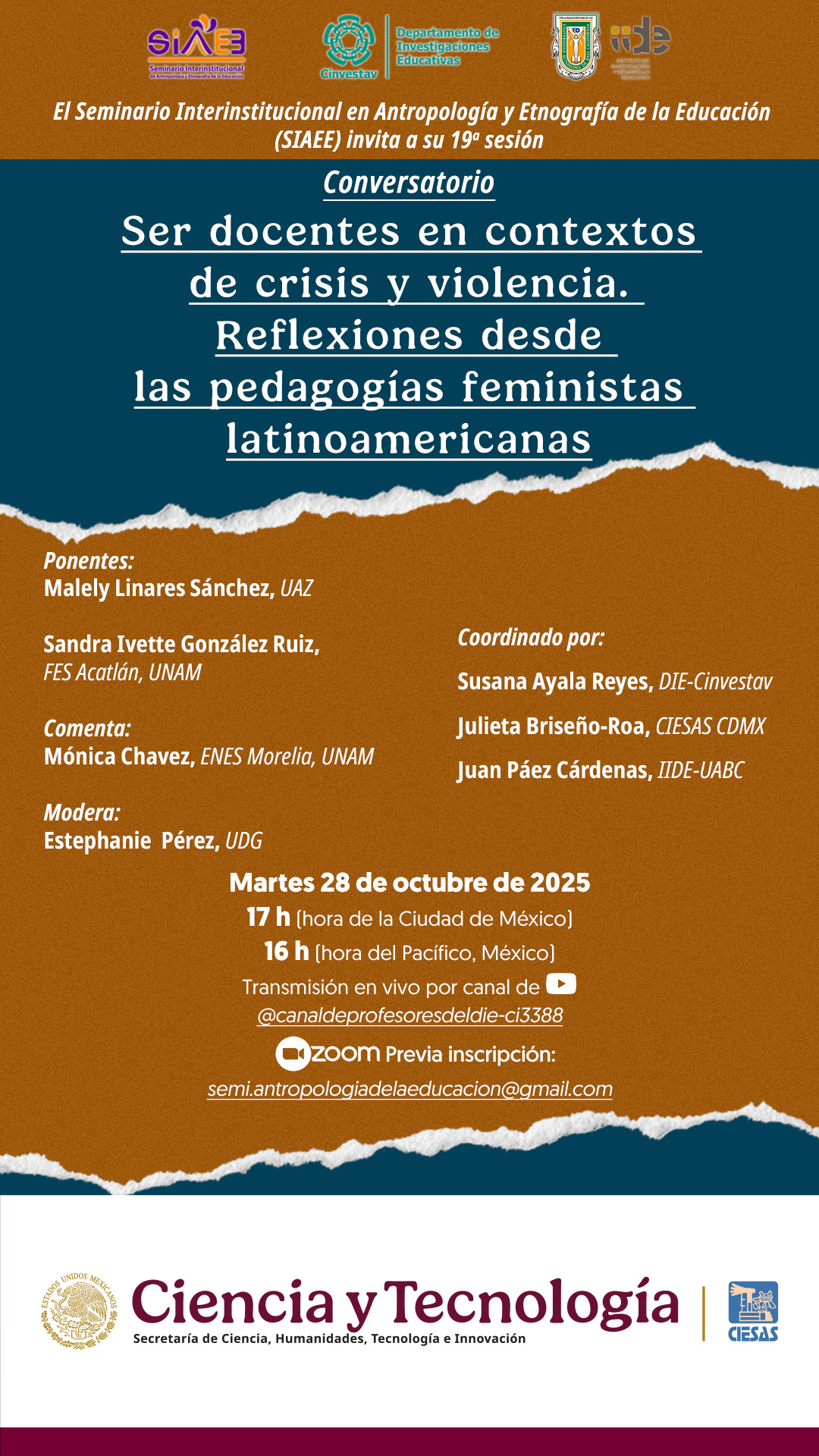La sesión podrá seguirse por YouTube. Para adquirir la liga de Zoom es necesario solicitarla al correo semi.antropologiadelaeducacion@gmail.com