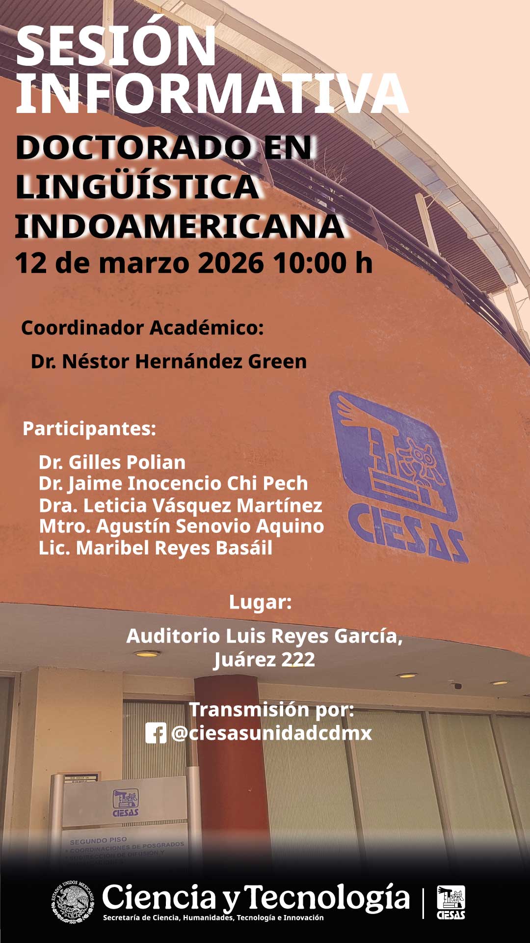 La Subdirección de Docencia del CIESAS invita a los aspirantes a ingresar al Doctorado en Lingüística Indoamericana, promoción 2026-2030 a ver la Sesión Informativa de la convocatoria, en la que podrán conocer a profundidad el Plan de Estudios y los requisitos para poder ingresar al posgrado.