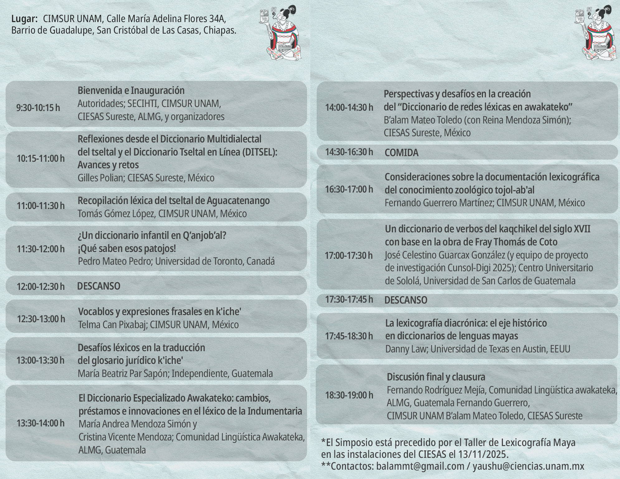 Com parte del Proyecto LEXMA: Documentación y descripción lexicográfica en lenguas mayas, el Cimsur Unam, el CIESAS Sureste y la Academia de las Lenguas Mayas de Guatemala invitan al Taller de Lexicografía Maya (13-nov) y al Primer Simposio de Lexicografía Maya (14-nov), en los que se abordarán temas relacionados con la lexicografía tales como documentación, herramientas, corpus, tipos de diccionarios, aspectos metodológicos y prácticos, etc.