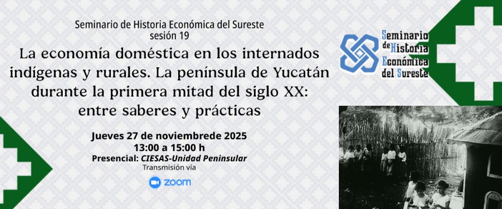 noviembre 27 @ 1:00 PM - 3:00 PM La economía doméstica en los internados indígenas y rurales CIESAS Peninsular Km 5.5 Carretera Sierra Papacal – Chuburná, Merida, Yucatán, México Modalidad híbrida. CIESAS Peninsular, Mérida, Yucatán | Zoom Gratuito